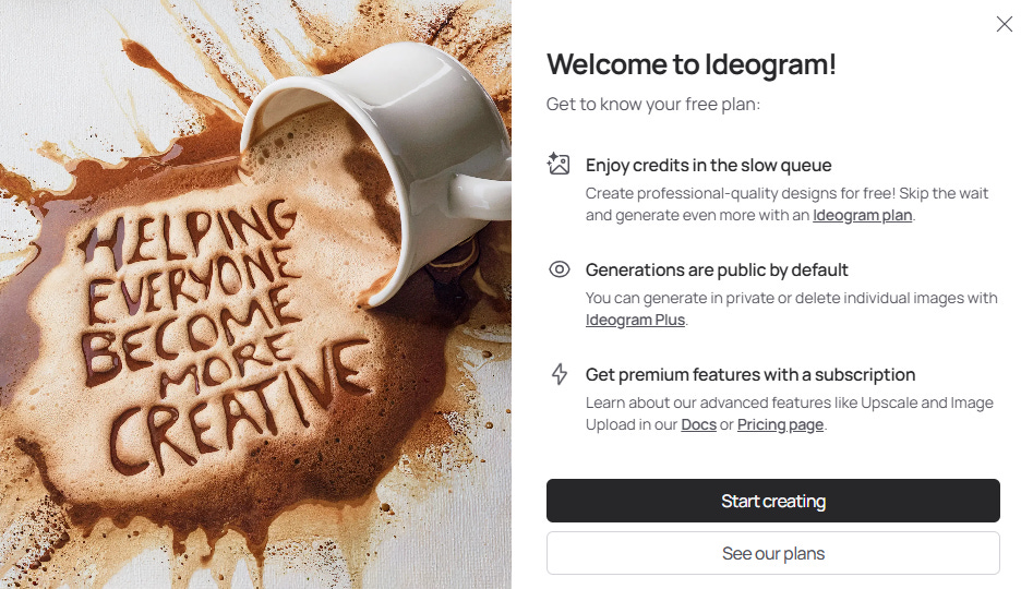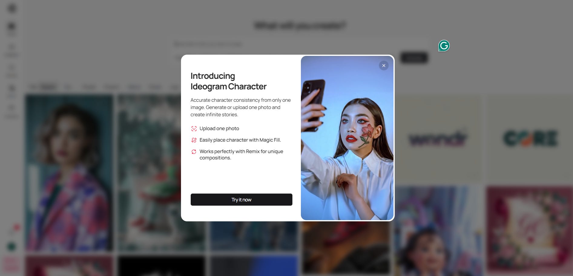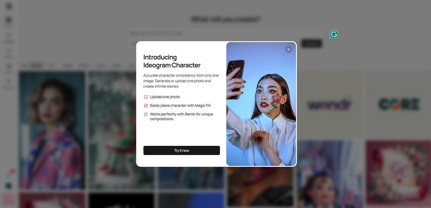 Dale clic en Start Creating y te saldrá un banner nuevo que dice “Introducing Ideogram Character”.