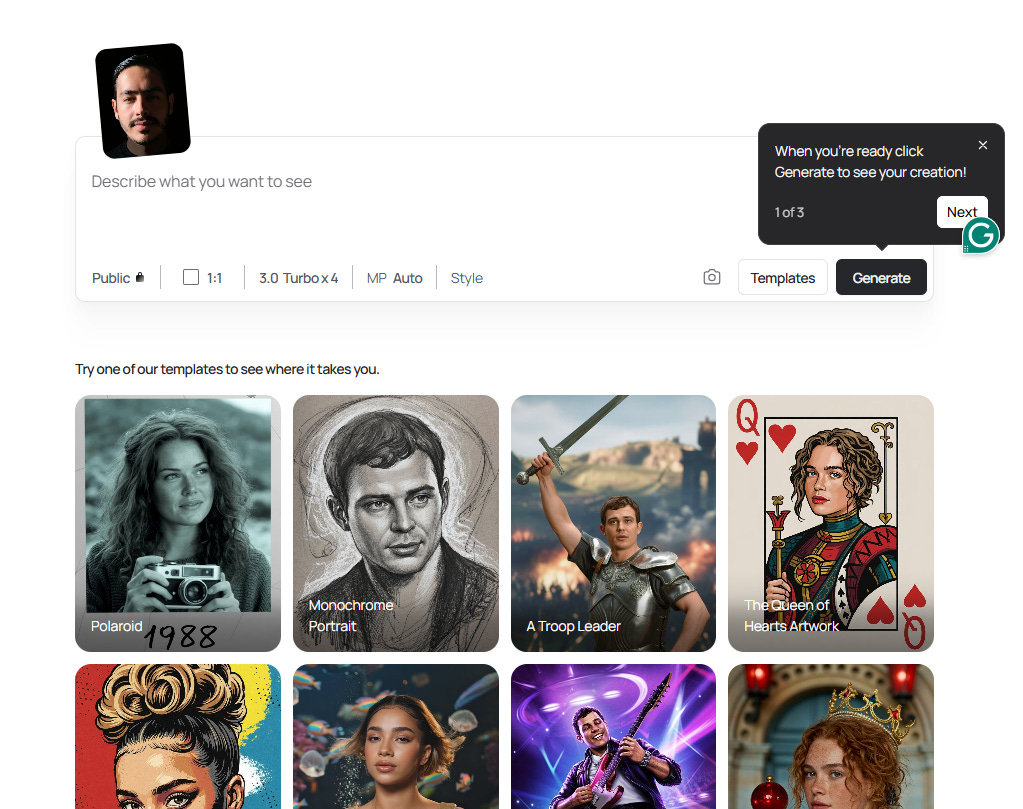 Selecciona una de las plantillas predeterminadas, el prompt se llenará automáticamente y le das clic en generate.