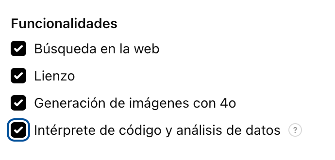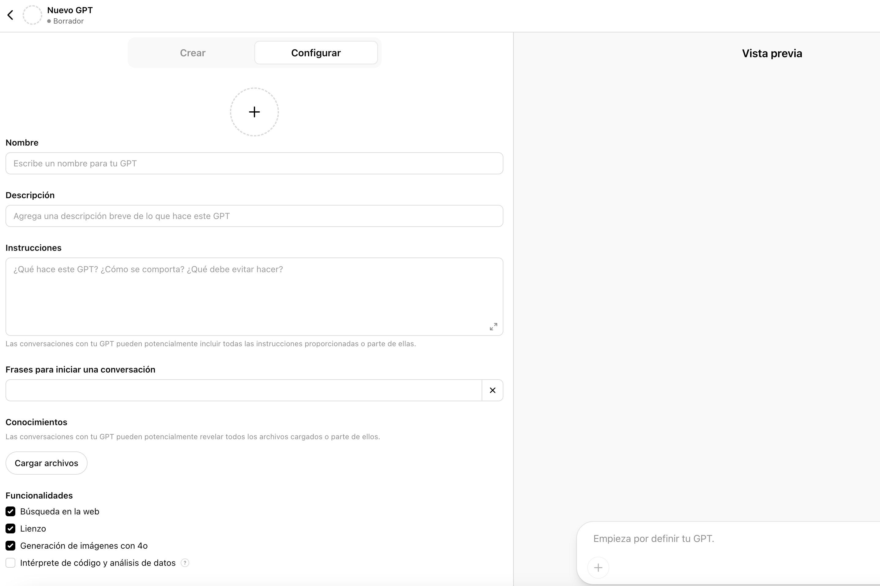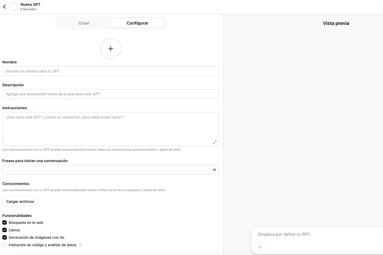 Herramientas de configuración: Incluidas en la interfaz de ChatGPT para personalizar tu GPT